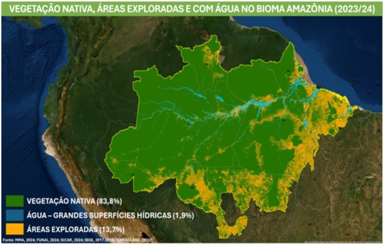 Mais de 83% do bioma Amazônia está com vegetação nativa (florestal, não florestal e mistas). As grandes superfícies hídricas (rios, lagos e barragens) totalizam quase 2% do bioma. Ambientes naturais (vegetação nativa e superfícies hídricas) somam mais de 85% do bioma, segundo estimativas e números atualizados regularmente pela Embrapa Territorial(Fig. 2).