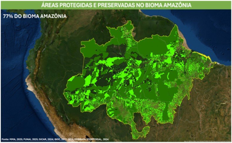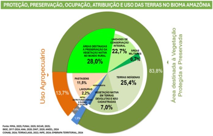 As áreas já protegidas e preservadas somam quase77% do bioma (Fig. 3). As protegidas alcançam cerca de 49%. São mais de 200 Unidades de Conservação, 330 Terras Indígenas e 32 Áreas Militares. Imóveis rurais registrados no CAR dedicam à preservação da vegetação nativa (reserva legal e APPs)uma área equivalente acerca de 28% do bioma. Terras devolutas e não cadastradas ocupam algo como 7% do bioma Amazônia.