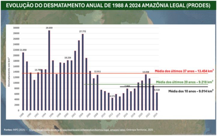 Desde 1988, o Programa Prodes do INPE mapeia o desmate anual na Amazônia Legal. No início, estimou a área já desmatada, do século XVI a 1988, em 270.000km². Entre 1988 e 2024, o Prodes totalizou 498.000km². Os dois períodos, do século XVI a 2024, somam 768.000km²ou 18,3% da Amazônia Legal, sem descontar a regeneração florestal ocorrida durante esse período. O processo tende à redução. A média anual de desmate em 37 anos foi de 13.545 km². Nos últimos 20 anos, caiu para 9.218 km²e nos últimos 10 anos para 9.014 km² (Fig. 5).