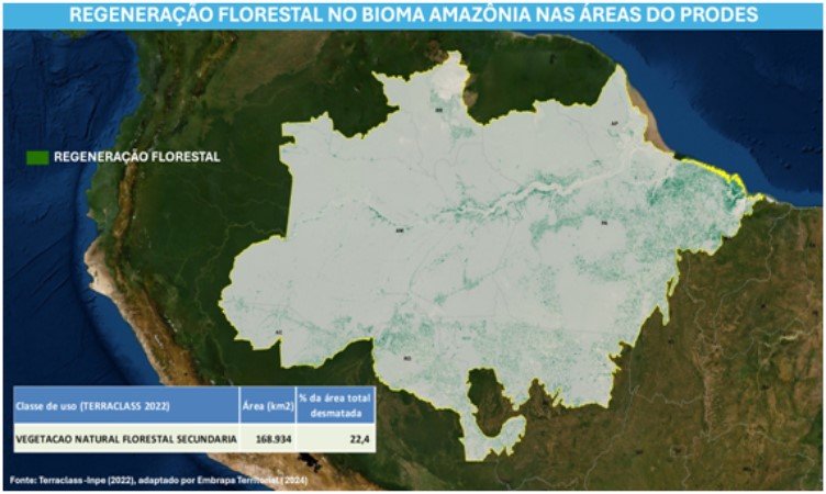 Em 22% das áreas desmatadas, a floresta regenerou ou está em adiantada regeneração. O Projeto Terraclass, coordenado pela Embrapa, com o INPE, analisa a evolução do uso das terras desmatadas. O mapa abaixo ilustra a regeneração florestal de 169.000km² em 2022 no bioma Amazônia (Fig. 6).