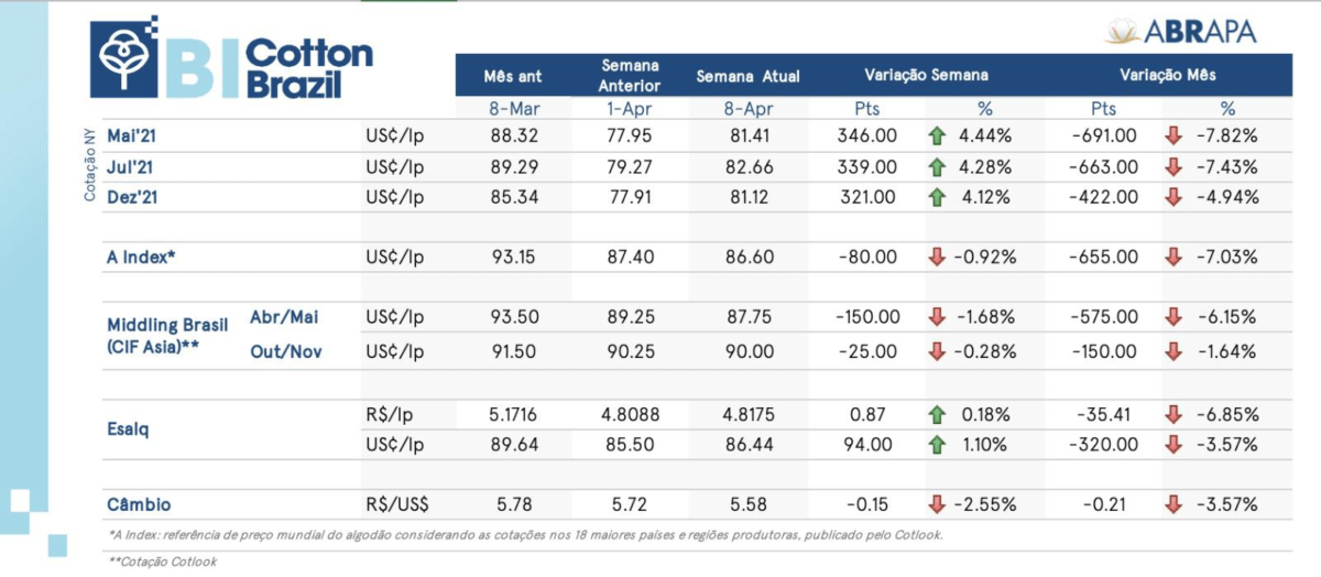 Preços – O preço do algodão brasileiro Middling 1-1/8” (31-3-36) posto Ásia está cotado a 87,75 U$c/lp (-150 pontos na semana) para embarque em abril-maio/21 e 90,00 U$c/lp (-25 pontos) para embarque em out-nov/21. Tabela com mais detalhes abaixo.