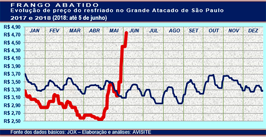 Cotado por valores que variaram entre R$4,70/kg e R$4,80/kg (base: produto resfriado negociado no grande atacado da cidade de São Paulo), o frango abatido alcançou na terça-feira (5/6) valorização de 68,1% em relação aos preços que vigoraram apenas um mês atrás, nos primeiros dias de maio.