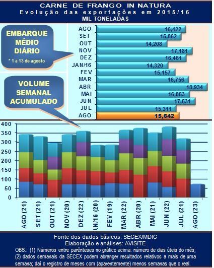 Não é o desempenho que o setor aguardava. De toda forma, ao subirem de 14.976 toneladas para 16.307 toneladas, os embarques diários de carne de frango da segunda semana de agosto aumentaram perto de 9% em relação à semana inicial do mês.