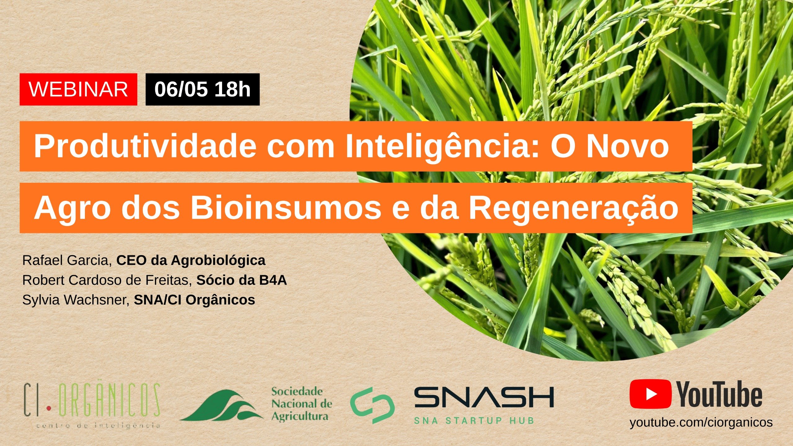 O Centro de Inteligência em Orgânicos (CI Orgânicos), em parceria com SNASH (SNA Startup Hub), promoverá no dia 6 de maio, às 18h, o webinar com o tema “Produtividade com inteligência: o novo agro dos bioinsumos e da regeneração”. O encontro reunirá especialistas que atuam diretamente no desenvolvimento de bioinsumos e na análise avançada da saúde do solo, com a proposta de conectar ciência e prática no campo.