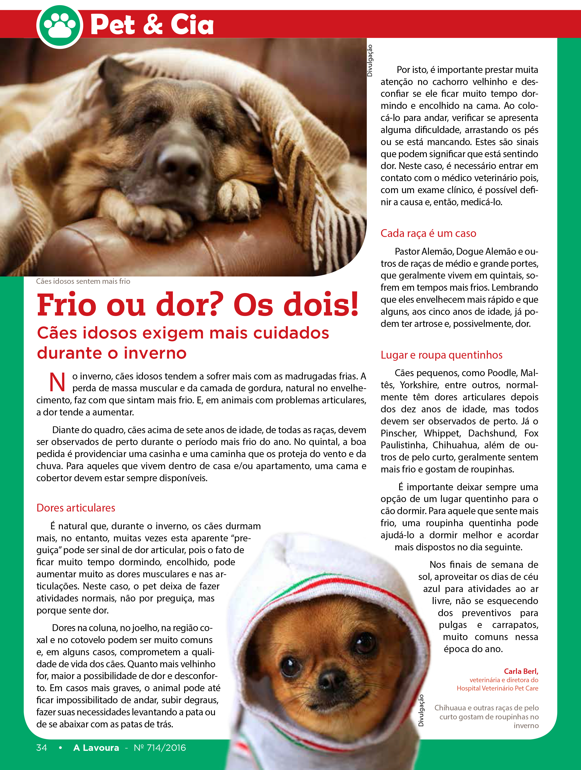 No inverno, cães idosos tendem a sofrer mais com as madrugadas frias. A perda de massa muscular e da camada de gordura, natural no envelhecimento, faz com que sintam mais frio. E, em animais com problemas articulares, a dor tende a aumentar. Esse assunto foi publicado na seção Pet&Cia da Revista A Lavoura, página 34 da edição nº 714/2016.